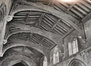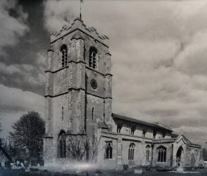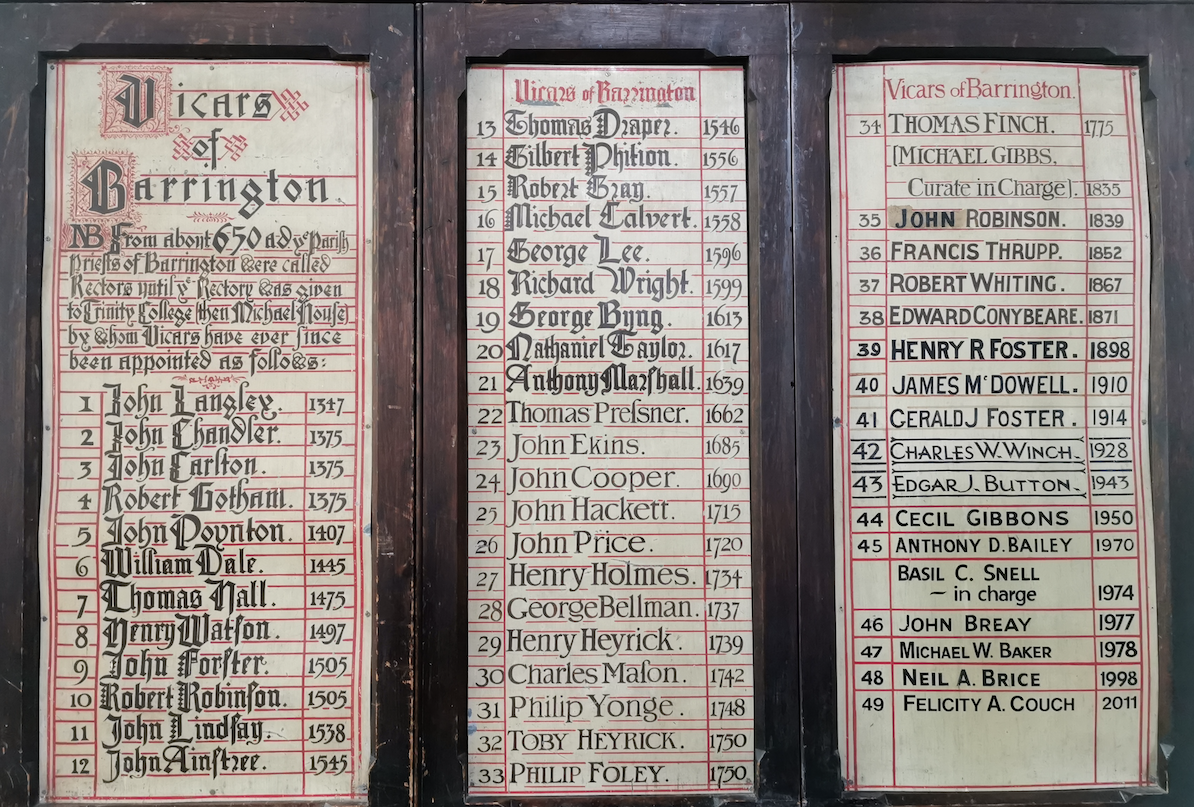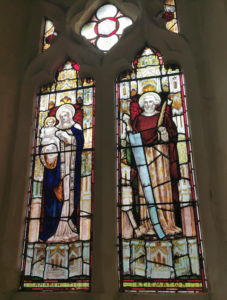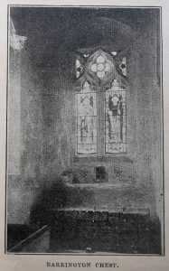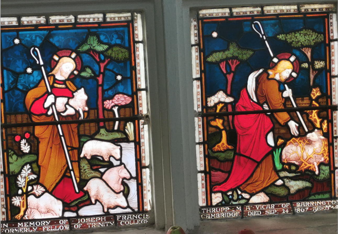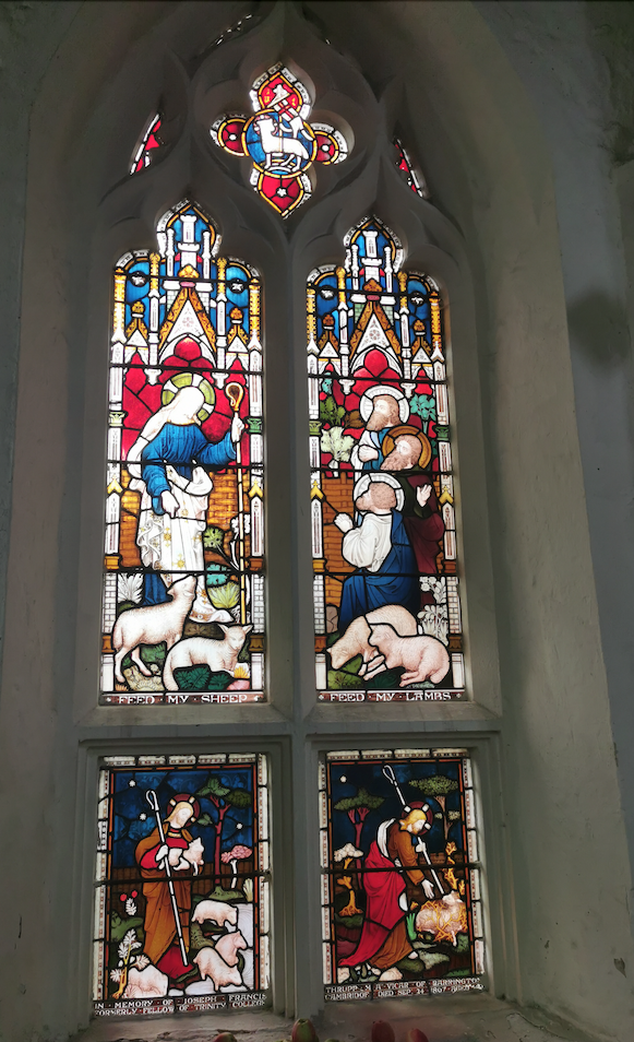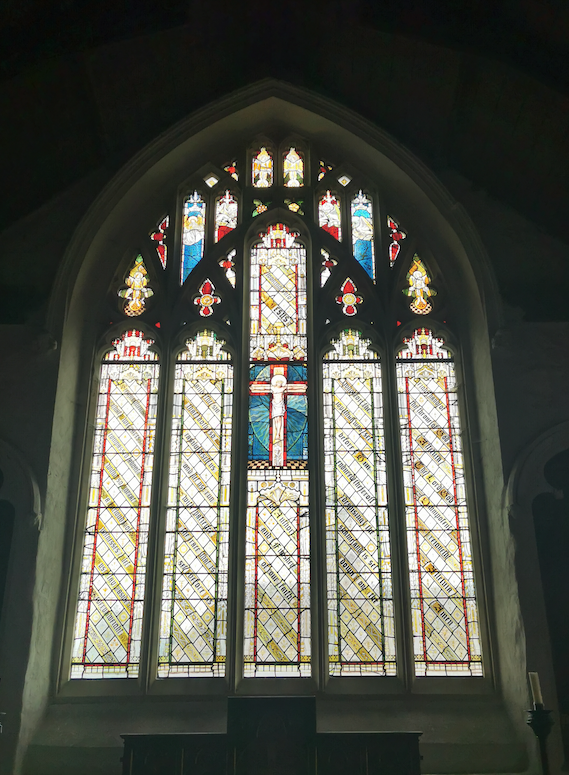 Chancel window, All Saints Barrington (RGL 2022)Parish Church. Nave, chancel and north and south aisles, early C13. West tower early C13, C14 and completed C15. North aisle enlarged and clerestorey added late C14. Dressed clunch, and some limestone. Roman cement render to some of the clunch.