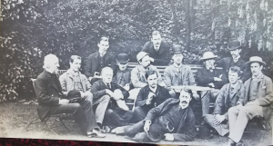 Fifth figure from right on seat is Prince Edward, later Edward VII. Smoking pipe is J K Stephen. On far left is J W Clark, Registrar of University, C V Stanford is lying on grass and on extreme right is H C Goodhart, St John’s College librarian.