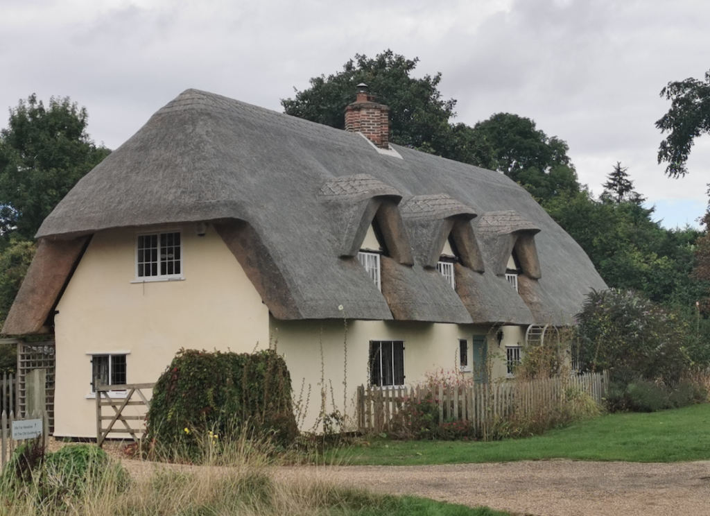 The Guildhall, Barrington (RGL 2022)Cottage. Probably 1657. Timber framed, lath and plaster rendered and long straw thatch roof, half hipped. Red brick ridge stack of grouped shafts set diagonally. Single range and four bay plan with lobby-entry. One storey and attic. Three gable dormers. Four casements, including two with leaded lights. Two panelled door to lobby.