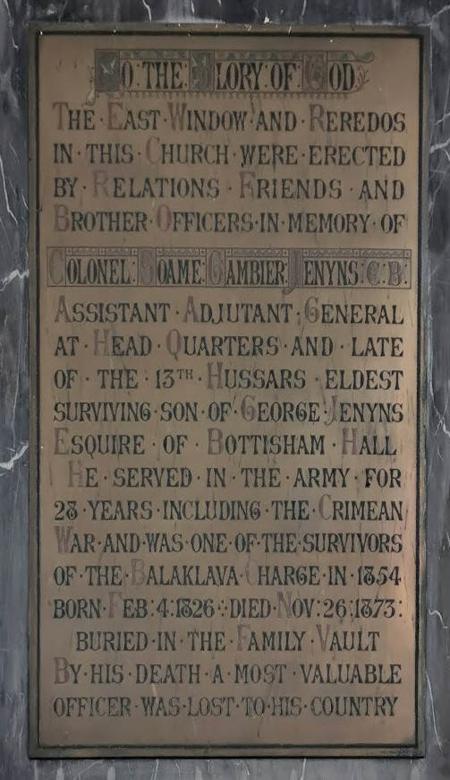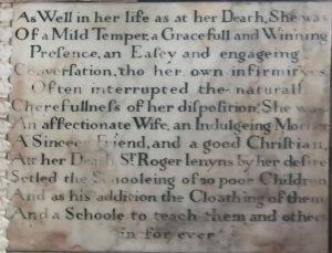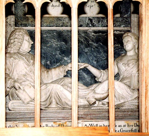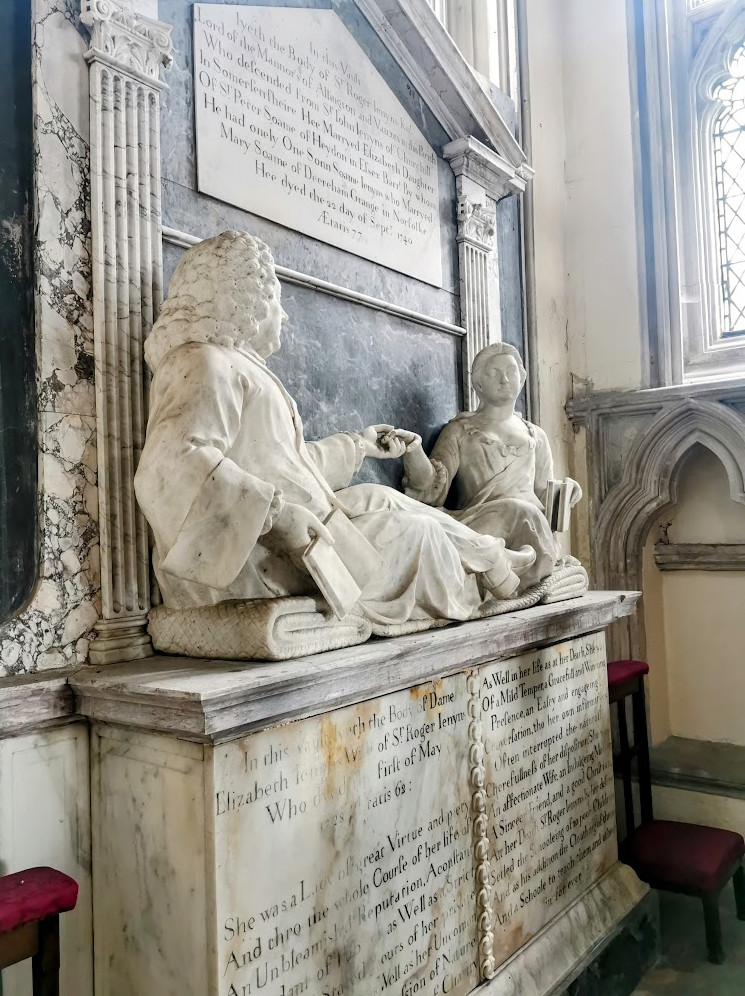 This monument represents the life size figures of Sir Roger Jenyns and his second wife Elizabeth, seated on rolled mats. They are in their night attire; this was not always considered very proper! Sir Roger was the first of the Jenyns family to own Bottisham Hall. He was responsible for the building of a school in 1730 a short distance from the church.