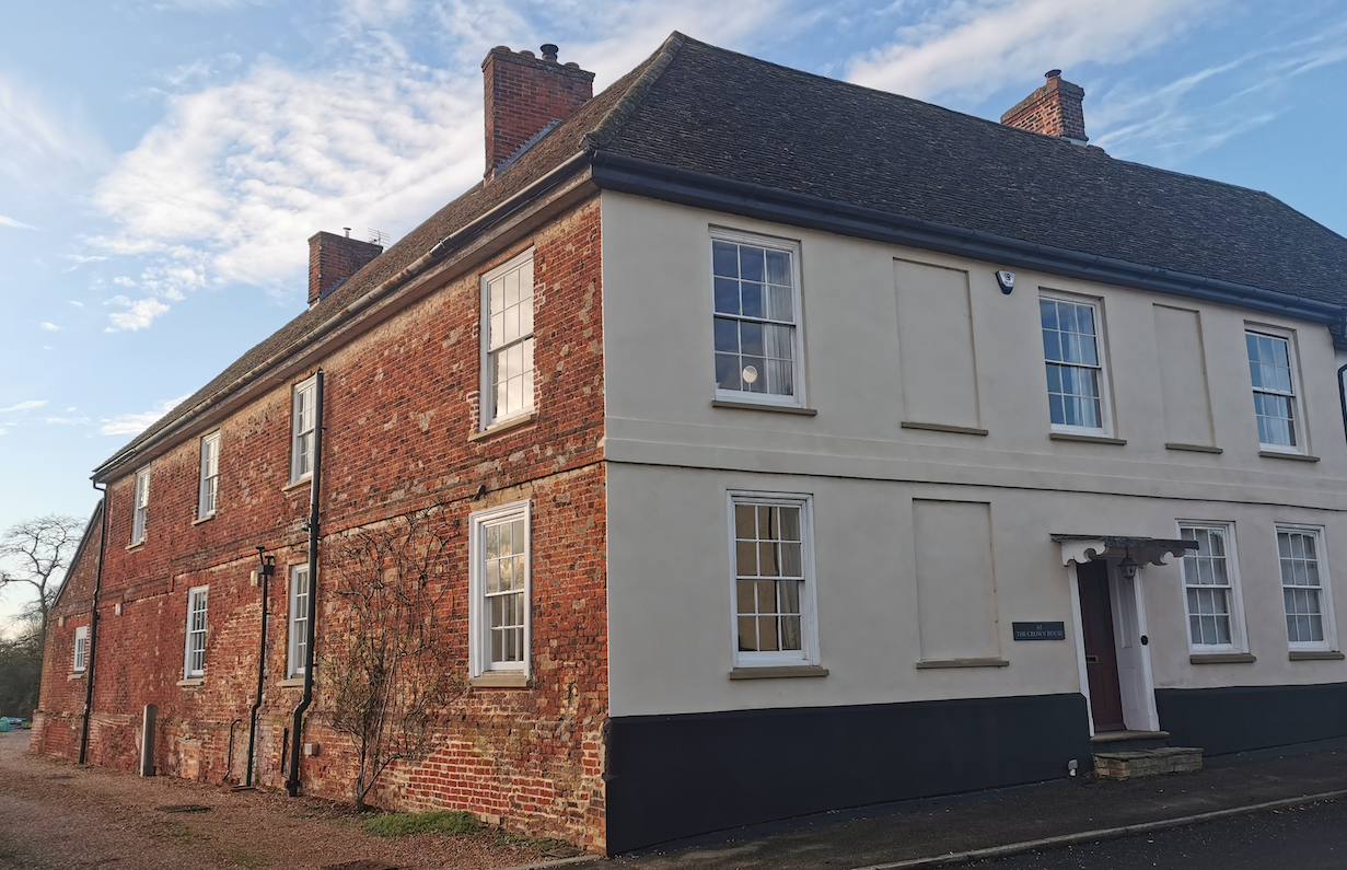 House formerly The Crown Coaching Inn. C16 or early C17 with later C17 and C18 alterations. C17 red brick, painted in street elevation, and exposed and plastered timber-frame. Hipped plain tile roofs.