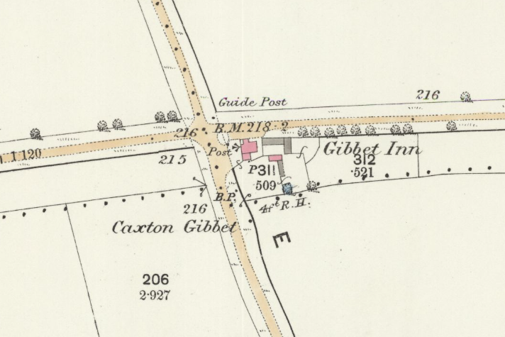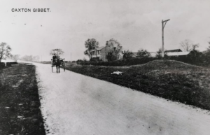 Caxton’s gibbet was rebuilt in 1934 using timbers from an old house in Baldock, only to be cut down in April 1939. Soon after a replacement was erected. (Vanishing Cambridge p85)