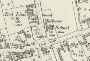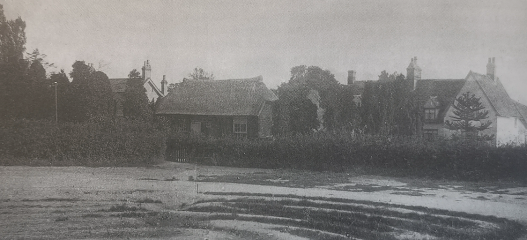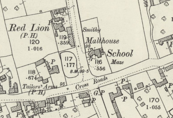 Comberton maze, c.1900 (photo W H Hayles) (Cambridgeshire Collection)According to Vanishing Cambridgeshire a turf maze, known locally as ‘The Mazles’ was cut at Comberton some time after 1660, probably as a copy of a surviving maze at Hilton. In 1846 it was enclosed in the playground of the village school. However a new maze was cut in 1909 on a different site and to a different design. This was destroyed in 1928 when the school was extended.