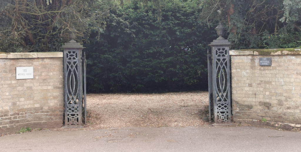 Wall, and gatepiers and gates. c.1830. Gault brick wall, with cast iron gates and gatepiers. The piers are surmounted by urn finials.