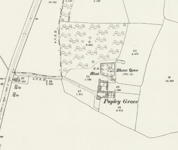 OS map 1901 EltisleyThe benedictine nunnery was established on land belonging to the Manor of Papley and was probably built on this moated site. In the mid 13th century the Bishop of Ely confirmed the site of the ruined Chapel at Papley to ‘Lettice the nun and her sisters.’
