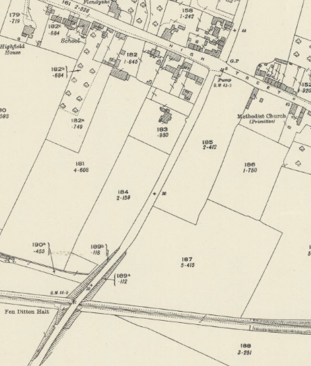This was location of ‘New Halt’ on Ditton Lane on the Cambridge – Mildenhall railway line. There was no platform, only adjustable steps.
