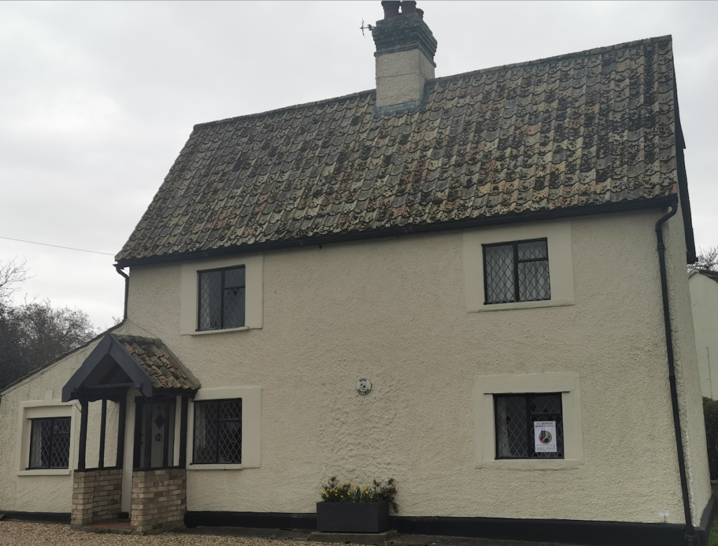 Cottage C17. Timber-framed and rough cast render. Pantiled roof. Central ridge stack partly plastered.