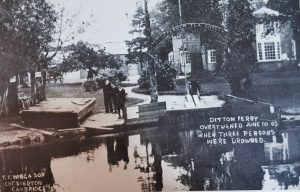 After the May Bumps in 1905 there was a fatal accident on the Ditton Ferry. The ‘Red Grind’ operated by James Skinner with Henry Clayton , the conductor, had already made two trips after the last race on 10th June. On the third thrip the boat had already left the shore with 22 passengers on board. Two University men jumped on board from three yards out and the ferry lurched breaking the chain. Three local girls who fell overboard were drowned.
