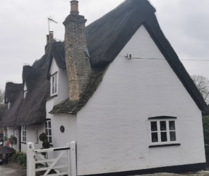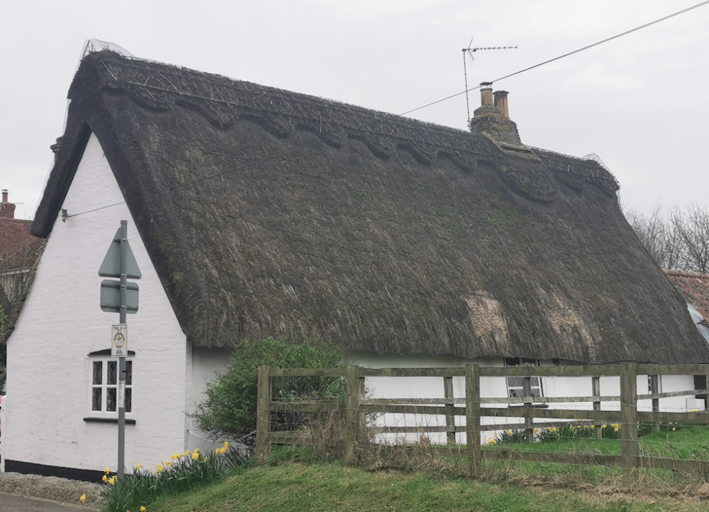 Cottage. C17. Timber-frame, plastered and painted brick. Long straw thatched roof with plain tiles to outshut with chimney stack to right hand.