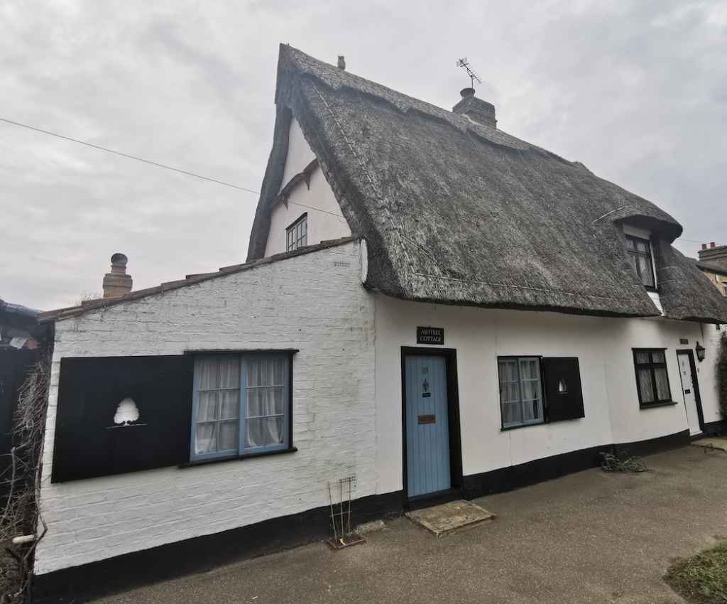 Pair of cottages. Early C19. Timber-framed and plastered. Long straw thatched roof.