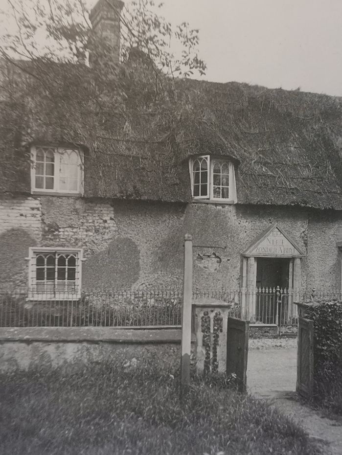 The cottage is described by C L Cudworth in ‘Dutch Influence in East Anglian Architecture as ‘near the church’. The stone doorway is dated 1713 and has the inscription in Dutch: ‘Niet zonder Arbyt’ – ‘Nothing without Work’. There is a legend associating the house with Cornelius Vermuyden, but he had lived in the previous century. (See Vanishing Cambridgeshire p.106).