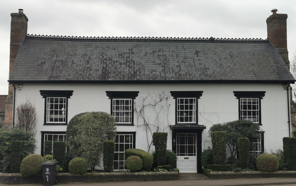 House early C17, remodelled 1807 and later in C19. Timber framed, brick, stucco and roughcast render with slate and plain tiled roofs. Projecting red brick end stacks of C17 with offsets.