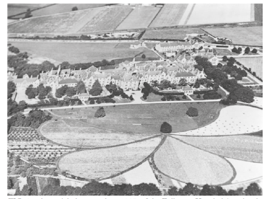 The Cambridgeshire Asylum provides an unusual example of the combination of aesthetics and the agricultural use of the land. In front of the asylum huge petal-shaped beds were created. In an aerial photo taken about 1927 these beds appear to have been planted with crops and Stephanie Skene suggests that they would always have had an agricultural as well as decorative use. Here the curving paths would have allowed patients close access to the ordered land.