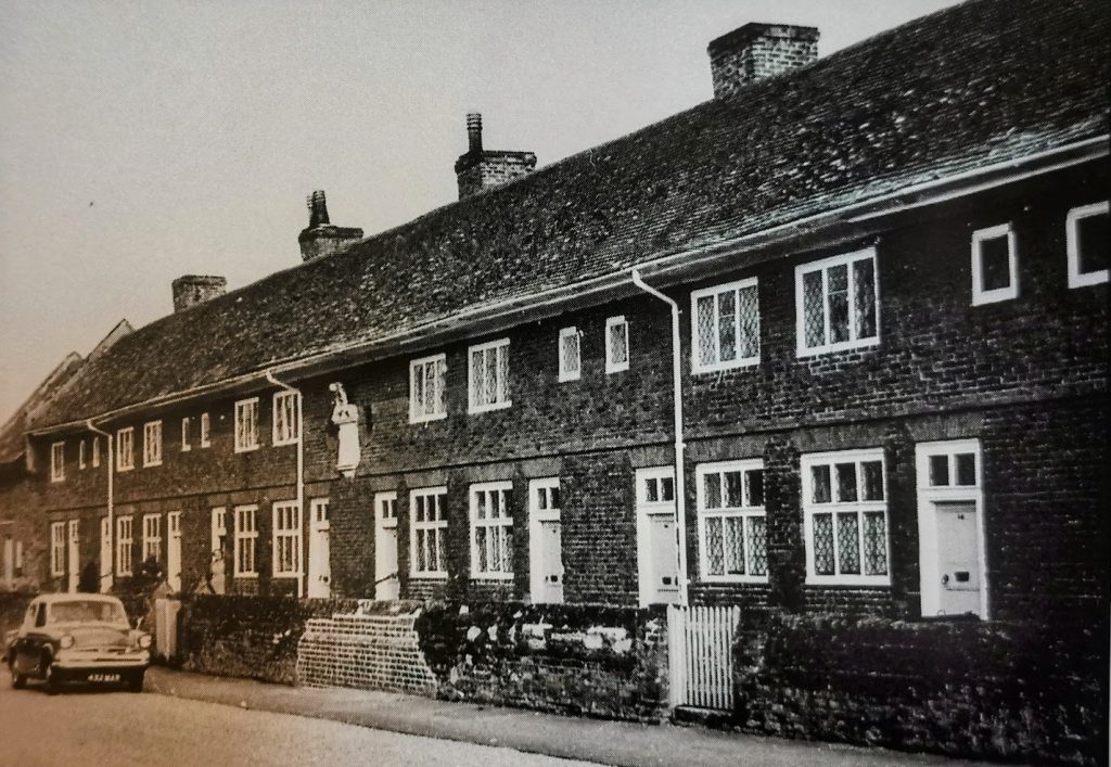 Terrace of ten almshouses. 1665. Red brick, Flemish bond. … The almshouses were built with an endowment from Sir John Jacob. (Historic England)