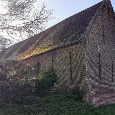 School and schoolhouse, now parish room and cottage. 1848. … A stone panel inscribed “Gamlingay Schools 1848” in the tympanum. … Inside: the former school room retains a reredos. Reset possibly from Chapel of St Etheldreda, Ely Place, London or from the chapel in Hatton Garden, Holborn parish. (Historic England)