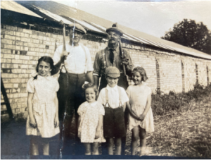 c. 1938 Trinity Farm, two farm workers with SB’s mother, front left, Donald (with cap on) and Clifford’s two eldest daughters (family)