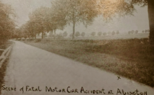 This postcard probably refers to the accident in 1908 reported in the Herts and Cambs Reporter and Royston Crow 29.5.1908. The exact location is unknown but was probably the main Cambridge to Linton road: