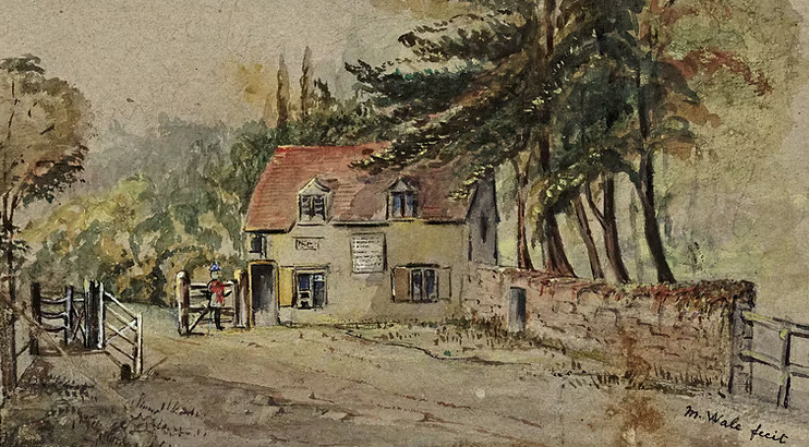Turnpike Cottage by Fanny Wales (Cambs Archives)Fanny Wale wrote in 1908: The turnpike cottage stood against the paling of Dr Ramsay’s garden and jutted out into the road. A man lived there in 1858 named Howe. He had to take a toll of one penny or two pence from every conveyance which passed through the gates. There was a tariff board on the cottage. One day an artist who had been making a sketch of the cottage went to look at the board, and read that two pence was charged for every Ass drawing. Sometimes at night the high heavy gate would be taken off its hinges by passengers who could not awake the old gate-keeper. The Turnpike and gate were removed in 1871.