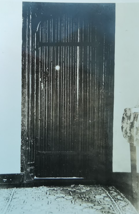 Old carved door ‘linen panneling’ Guilden Morden Hall, Mar 1928, east aspect (MoC284/57)