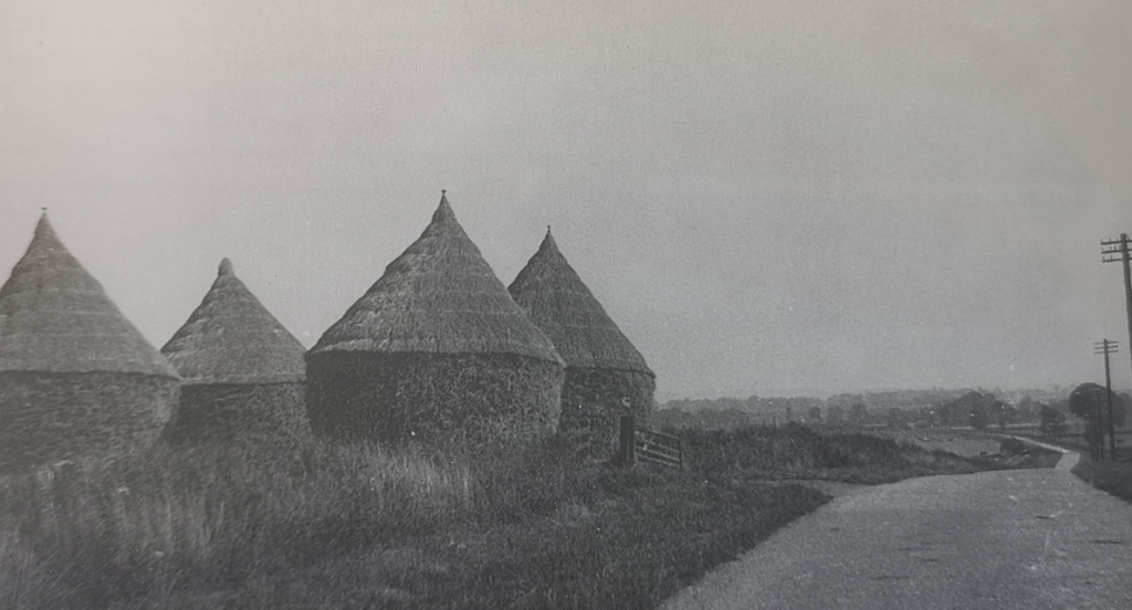 Guilden Morden, 1936, thatched stacks on the road to WrestlingworthVanishing Cambridge notes, p 114, that until the advent of corrugated iron, thatching of houses, barns and outbuildings was the norm. Skill was needed to ensure the thatch roofing kept the rain off.
