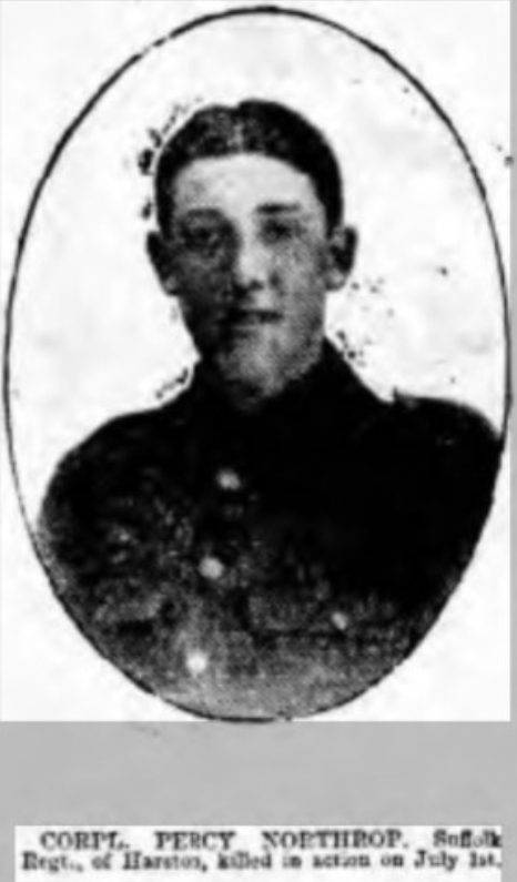 Percy Northrop joined the Cambridge Volunteer Battalion when he was only 16. He died on the first day of the Battle of the Somme, 1.7.1916.