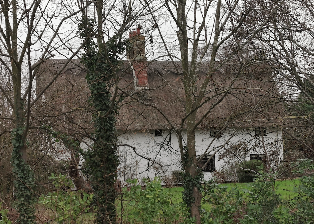 Cottage. C16 origins, altered and added to C17. Timber-framed, plaster rendered and reed thatched.