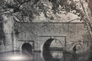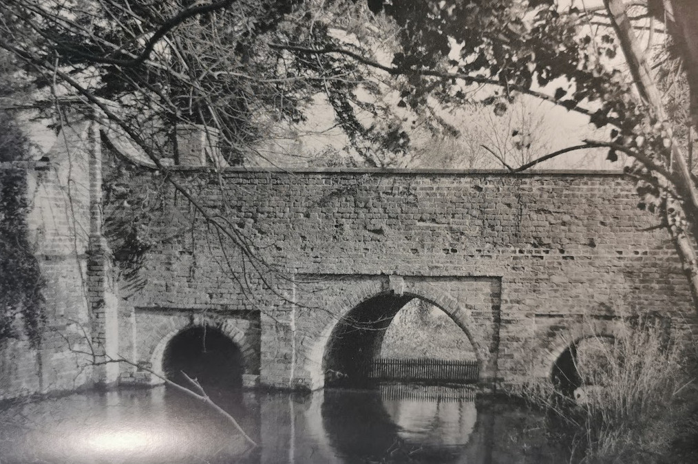 Bridge and adjoining moat wall. Late C17. Red brick, mainly English bond with limestone coping to parapet.