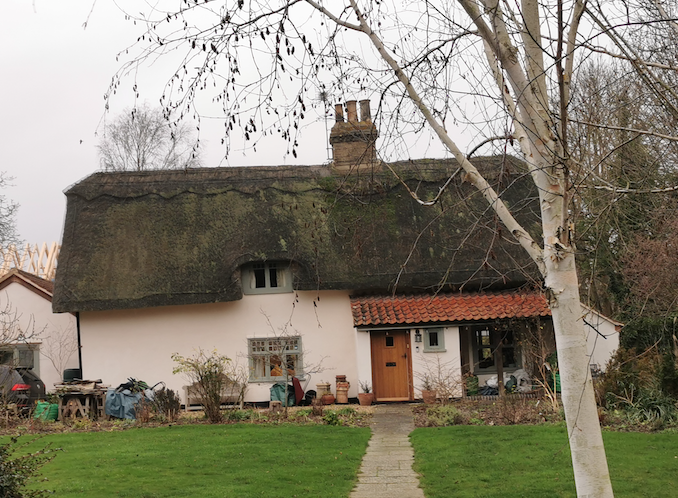Cottage. Probably early C18 origin, restored C20. Timber-framed, rendered and longstraw thatch.