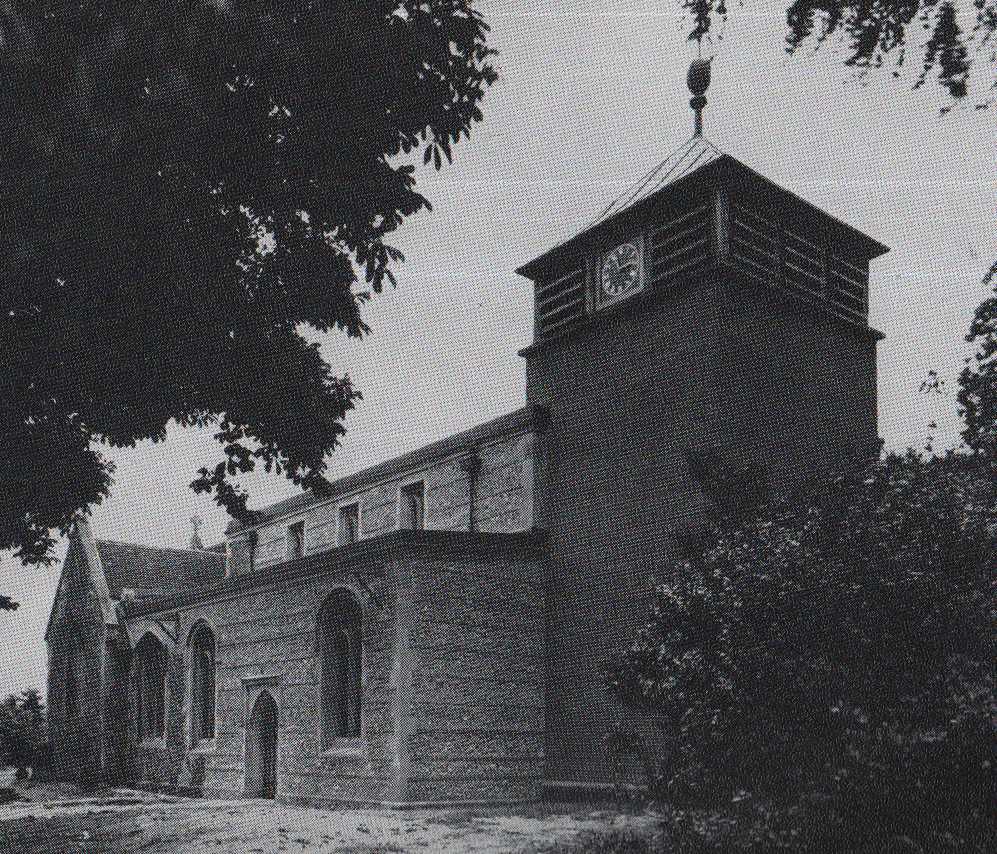 The photograph shows part of the north arcade and wall held up by strong wooden supports, the east end of the nave roof below which the chancel has been boarded off, and part of a support to the south arcade wall. The bomb blew out the five bells in the old tower. They were recovered and installed in the belfry which now has a pyramidal roof surmounted by a weathercock. The church was restored in 1956.