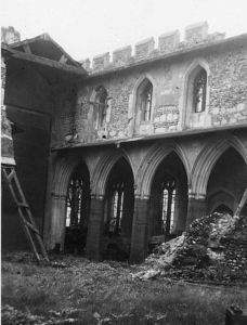 The photograph shows part of the north arcade and wall held up by strong wooden supports, the east end of the nave roof below which the chancel has been boarded off, and part of a support to the south arcade wall. The bomb blew out the five bells in the old tower. They were recovered and installed in the belfry which now has a pyramidal roof surmounted by a weathercock. The church was restored in 1956.