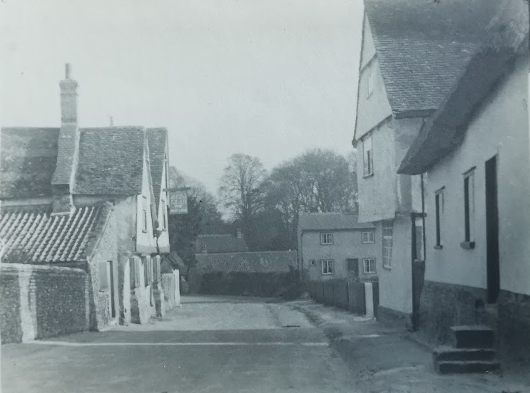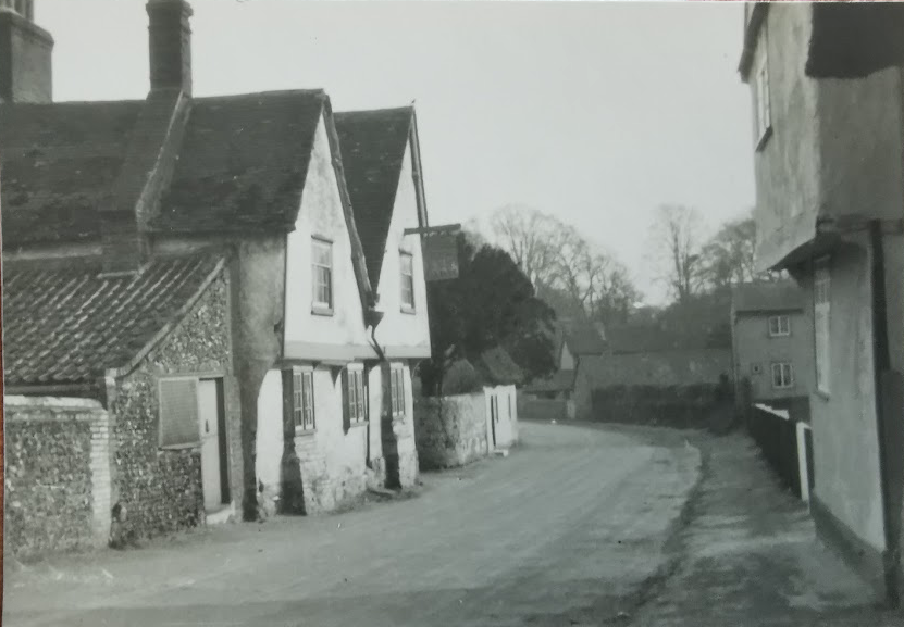 Inn. C17 or earlier. Timber-framed and plastered with painted and plastered brick plinth.