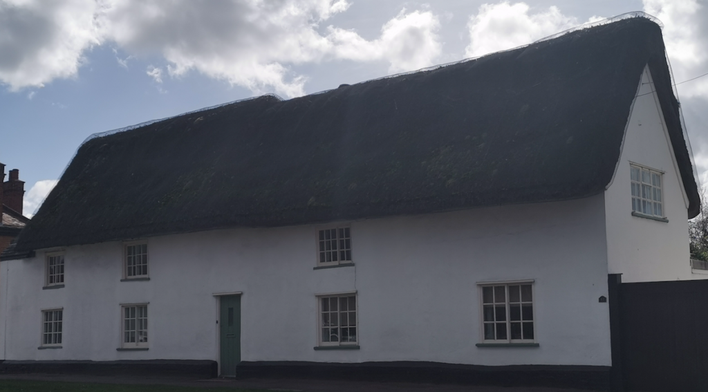 Cottage, originally three. C17 with modern alterations. Timber frame and plastered. Long straw thatched roofs.
