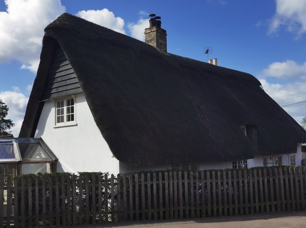 Cottage, formerly three. C17. Timber framed and plastered with thatched roof.