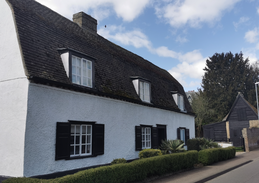 Cottage. C17. timber framed and plastered, half-hipped long straw thatched roof.