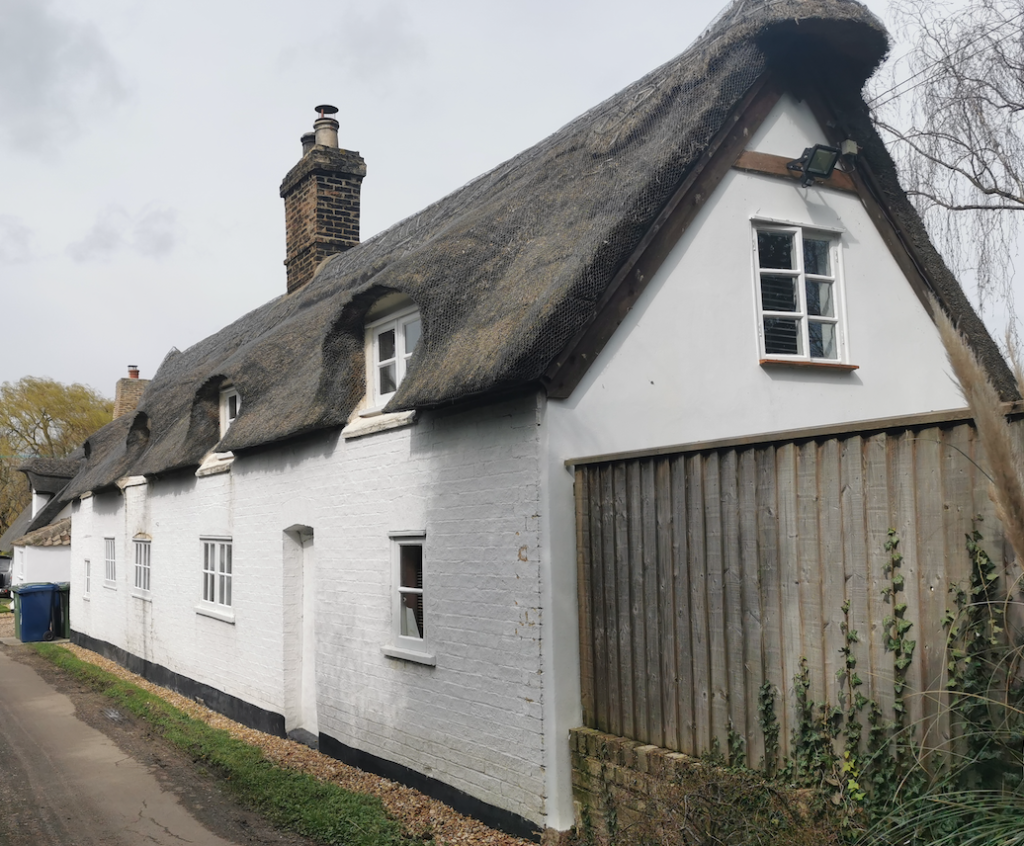 Pair of cottages, now one dwelling. Late C17, early C18. Timber framed with painted brick casing. Reed thatch; ridge stack.
