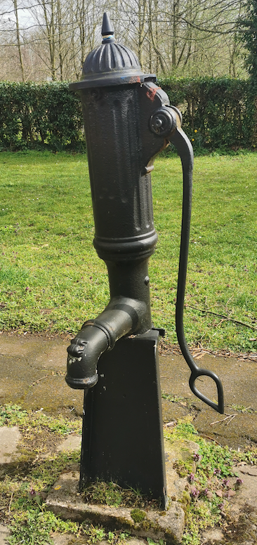 Pump, mid C19. Cast iron, with lever and spout. Domed cap with finial and fluted decoration to post.