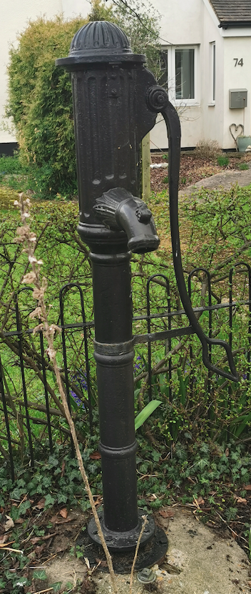 Pump, mid C19. Cast iron, with lever and spout. Domed cap without finial, and fluted decoration to post.