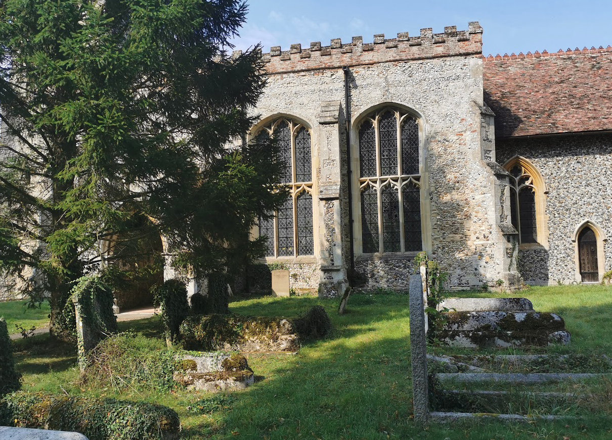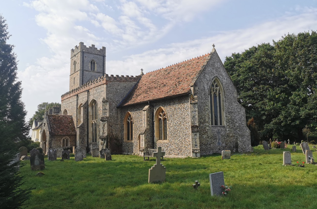 All Saints, Horseheath (RGL2024)C14 and C15. Restored 1829 and 1883 and later. Flint, fieldstone and clunch and limestone dressings. Tiled roofs, leaded. West tower, nave, south porch and chancel. West tower of four stages with later stepped and embattled parapet. Main cornice with central gargoyles. Restored C14 west window of two cinquefoil lights in two centred arch with original moulded and head mask stops. Lancets to each side of first stage. Bell stage openings are of two cinquefoil openings in two centred arch with similar label. Aisleless nave, rebuilt later C15. … Monuments: in chancel on south side: Sir Giles Alinyton (d.1522) and his son Giles (d.1586). Stone and marble two tiers each with one recumbent effigy. Each tier is connected by short bulbous fluted columns. The superstructure has been removed. North side Sir Giles Alington (d.1613) and Lady Dorothy attributed to N. Johnson. Alabaster tomb chest with recumbent effigies and reliefs of the children kneeling to the front. Intact back architecture. North side of chancel: stone wall monument Dorothy Wakefield (d.1622); William Elder 1709, marble wall monument.