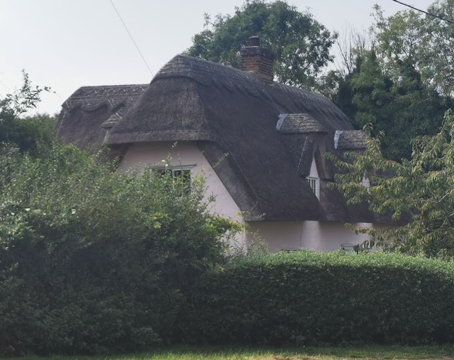 Cottage. Late C17 or early C18. Timber-framed, plastered and long straw thatch, half hipped roof.