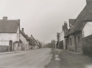 Cottage C17 or earlier. Timber-framed and plastered with brick casing. Thatched half hipped roof with plain tiled gabled dormer windows and main roof surround.