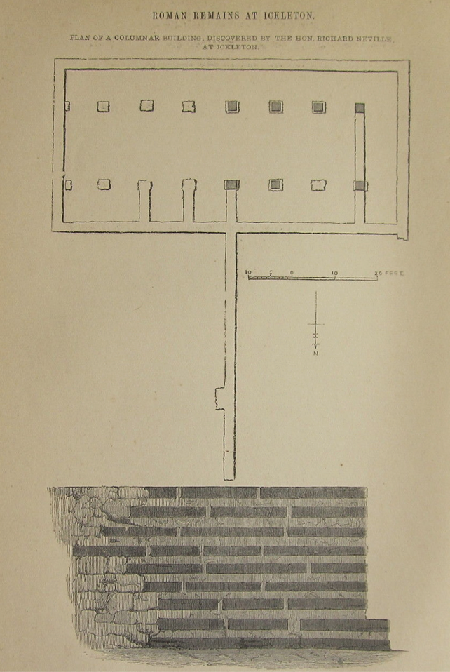 The Ickleton Roman farmstead was excavated by Richard Neville in 1849. It had been discovered in 1847 when a local farmer Samual Jonas noticed that stubble fires on Church Platt field burned especially fiercely. Neville discovered a villa and nearby a basilica.