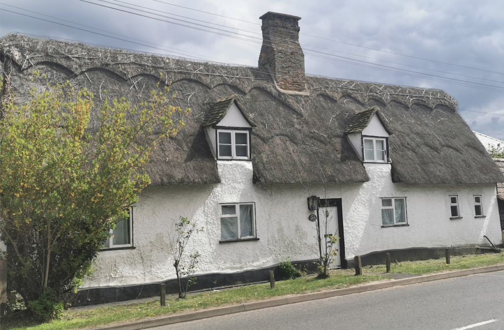 Cottage. Early C17. Timber framed and plastered. Long straw thatched roof. C17 local brick ridge stack.