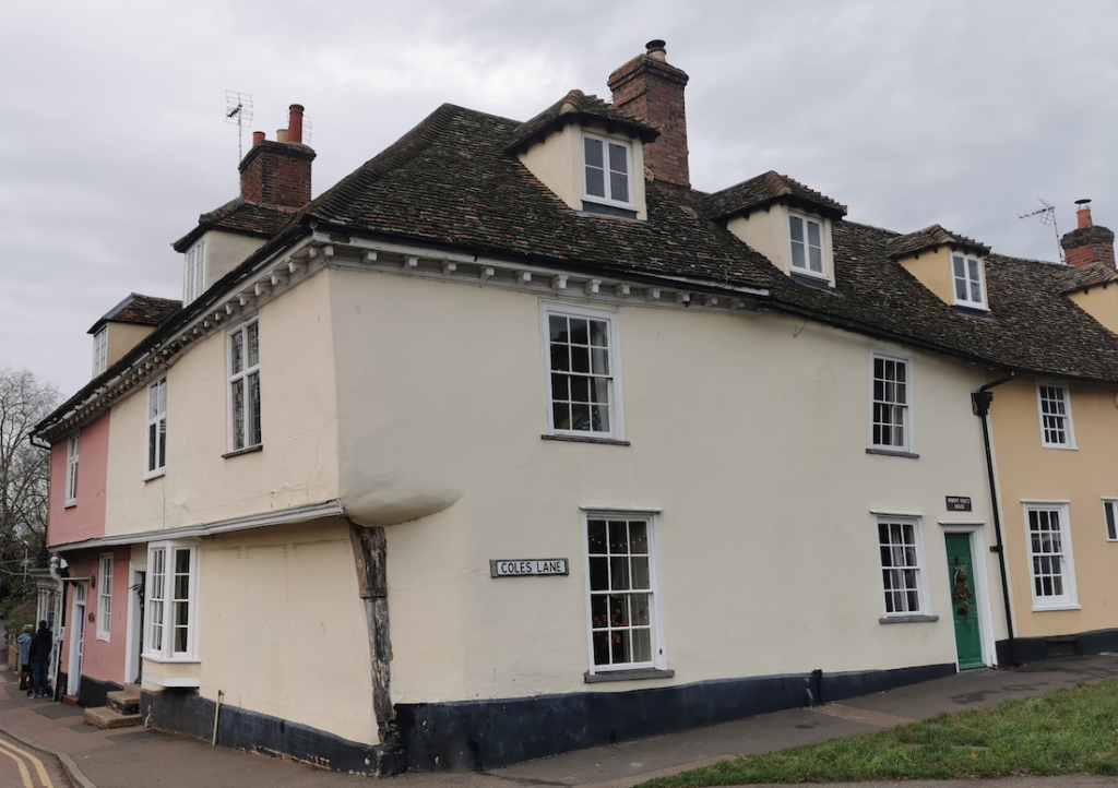 Robert Cole was a ‘considerable meal man’ and lived here in the eighteenth century. It has a beautifully carved bracket next to the grocer’s shop, and elaborate corbel table, remains of pargetting, and ancient glazed windows.