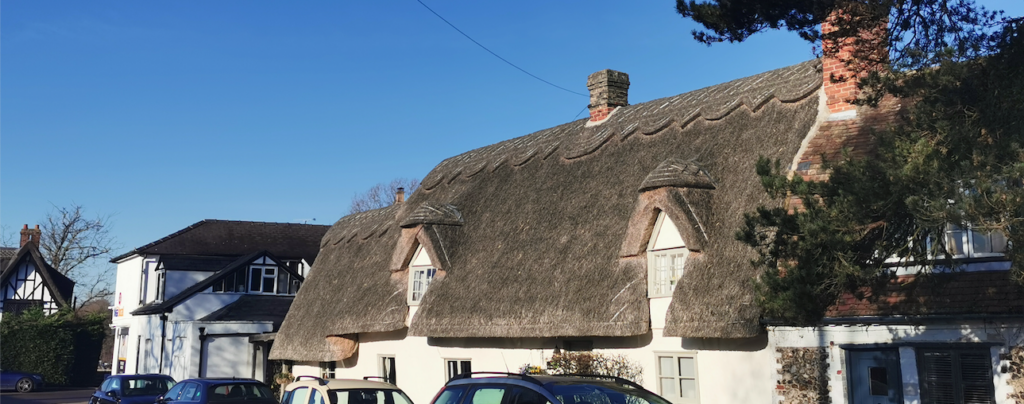 Cottage C16 with C19 extension (No. 5) to east. Timber-framed and plastered with thatched roofs, painted brick and pantiled mansard roof.