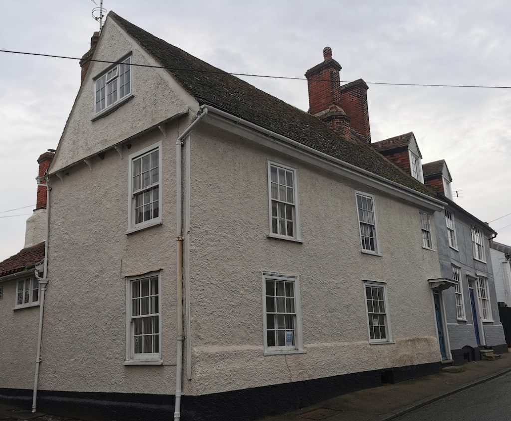 House. C16, remodelled C18. Timber-framed and plastered with high painted brick plinth. Plain tile roof. Ridge stack with late C16 moulded brick base.