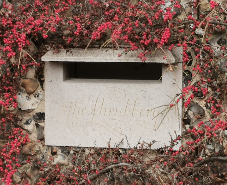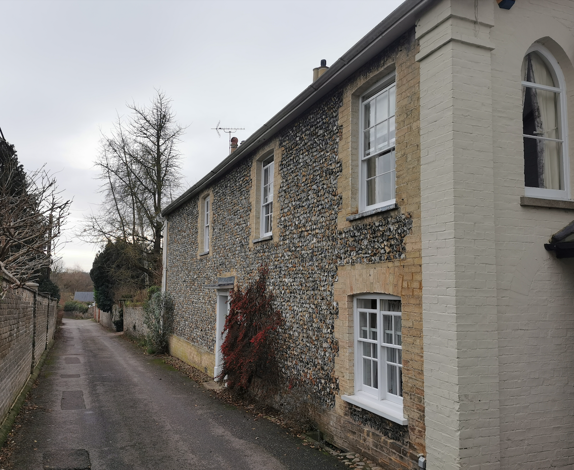 House. Early C19. Flint rubble with brick dressings and giant pilastered quoins.