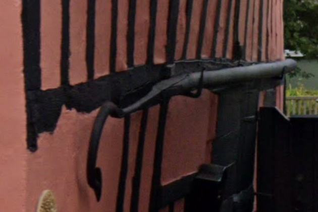On the side of Chandler’s hang two massive firehooks which were used for pulling the thatch off burning buildings. Under the eaves of the red brick nearly opposite, formerly the “Race Horse” Inn, hang rings, which has been conjectured were originally intended for the insertion of the firehooks.