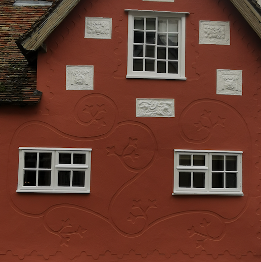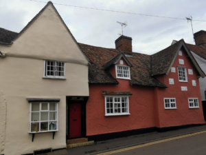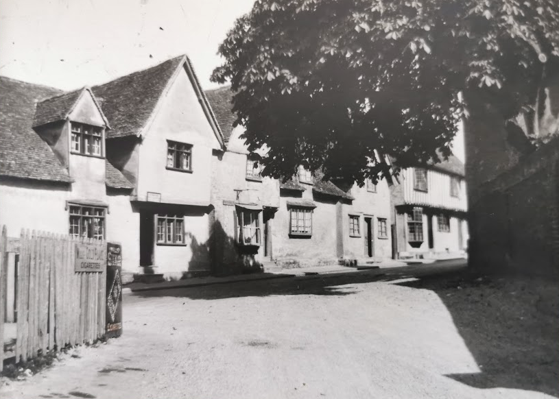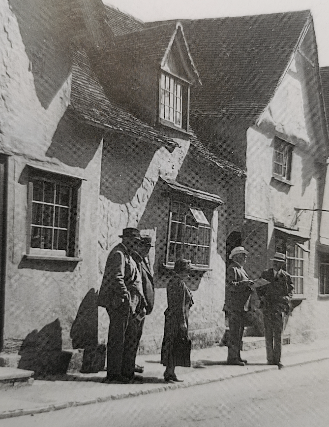 This is a half timbered house standing next the Bell. …. In one of the bedrooms is a piece of plasterwork, two cherubs pulling what looks like a Christmas cracker….. The age of the house is puzzling. In 1465 it was the residence of Thomas Milsent at the Maypole. A century later it belonged to someone else. Yet is has the Millicent family device, the fleur de lys built into it. ….. This messuage was known as Chandler’s from Adam the Chandler who lived here in 1380. An earlier owner was John Cok, who also owned a meadow by the river called “Cuxstool Meadow” where they ducked the “militants” of the fourteenth century.