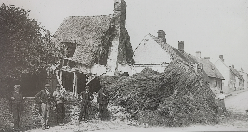 The cottage called Cats Castle was closed in January 1912 and the occupant, widow Mary Reader, evicted. It collapsed in 1913 after a hailstorm of exceptional severity hit the village. Windows were smashed by the hailstones and the streets for a time presented the unique spectacle of a flood being covered at the same time covered to a depth of several inches with hailstones of abnormal size. (CIP 30.5.1913)(Vanishing Cambridgeshire p.135)