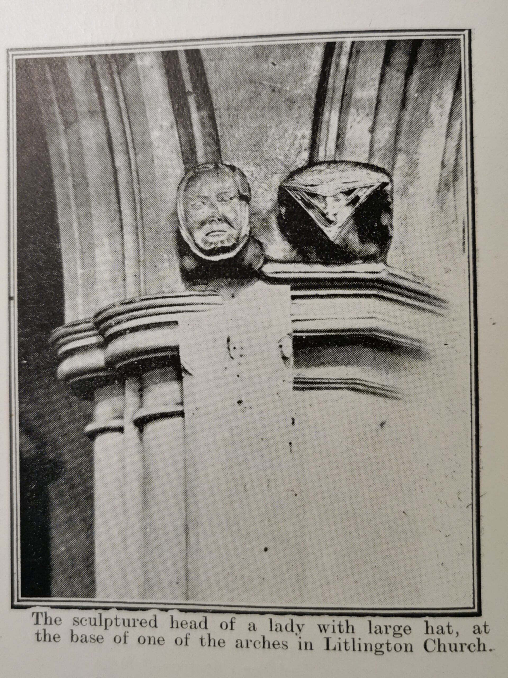 The ‘large hat’ is a 14th century headdress. There are also two interesting inscriptions, once noting the start of Francis Drake journey around the world.n Another says ‘tam mari quam terra 1594.’